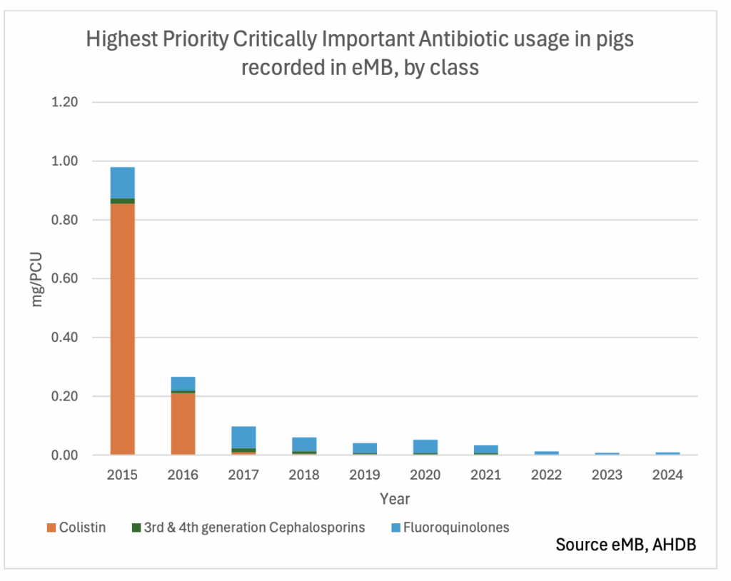 Data collected using the electronic Medicine Book (eMB) show that antibiotic use in UK pigs was 86 mg/PCU (milligrams per Population Correction Unit) in 2024, up from 85mg/PCU in 2023 and the low of 72mg/PCU in 2022.