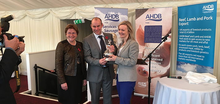 Andrew Knowles receives the 2015 David Black Award from Environment Secretary Elizabeth Truss as AHDB Pork chairman Meryl Ward looks on